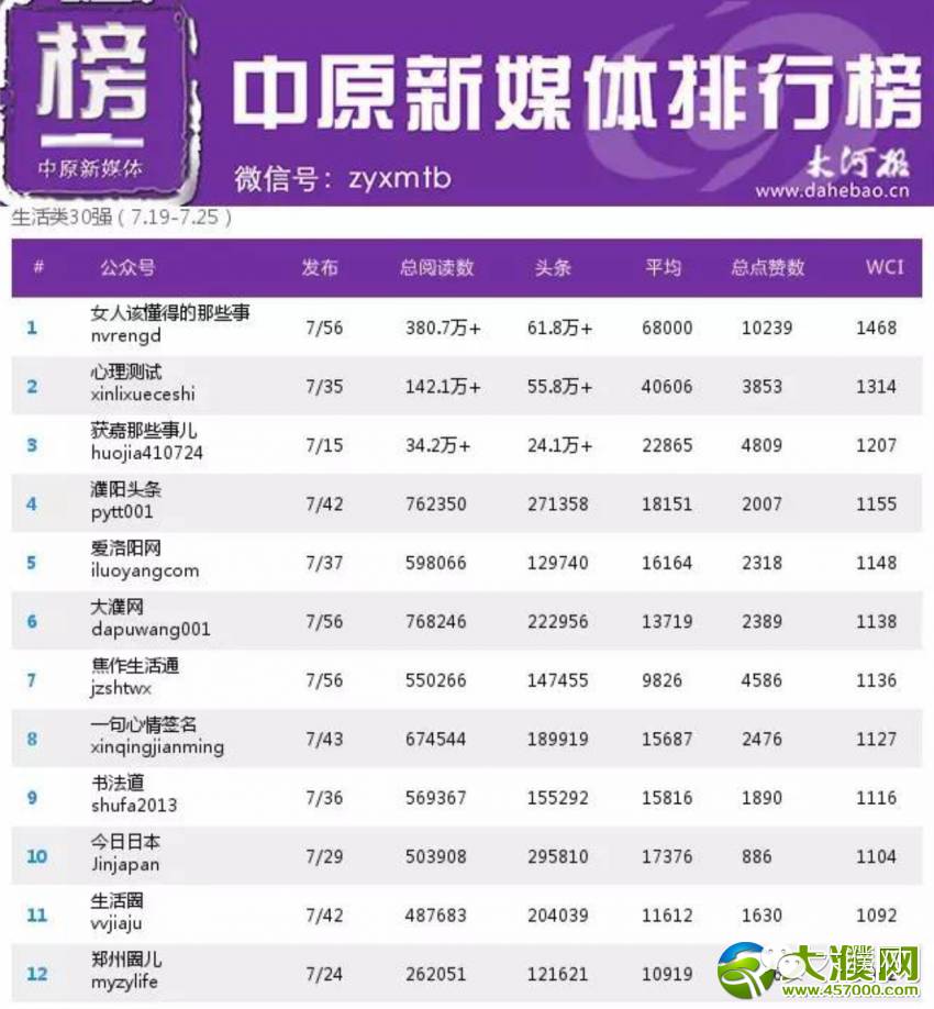 2015年7月27日中原新媒体排行榜发布的信息