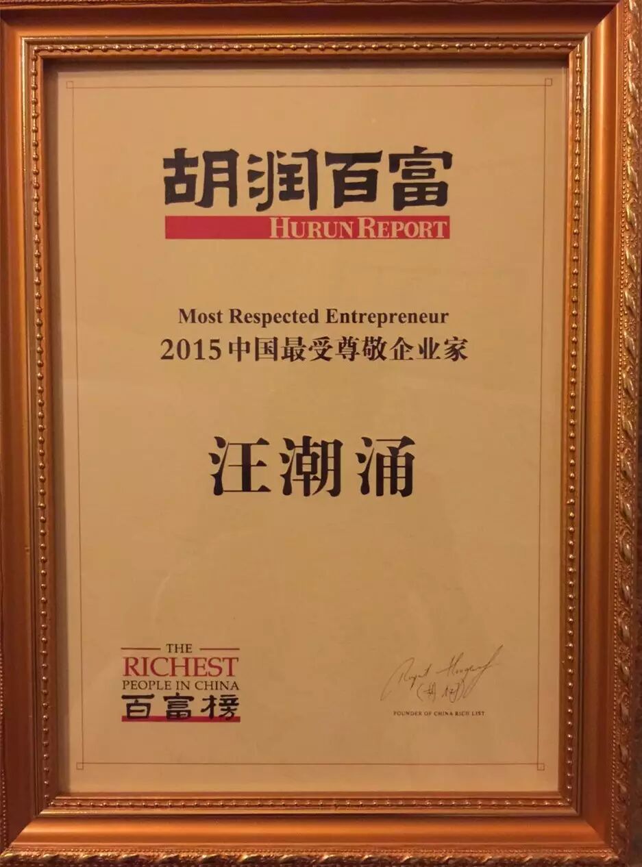 11月27日,2015年胡润百富周年庆典“最受尊敬企业家”颁奖晚宴在京举行。信中利董事长汪潮涌获评“2015中国最受尊重企业家”。